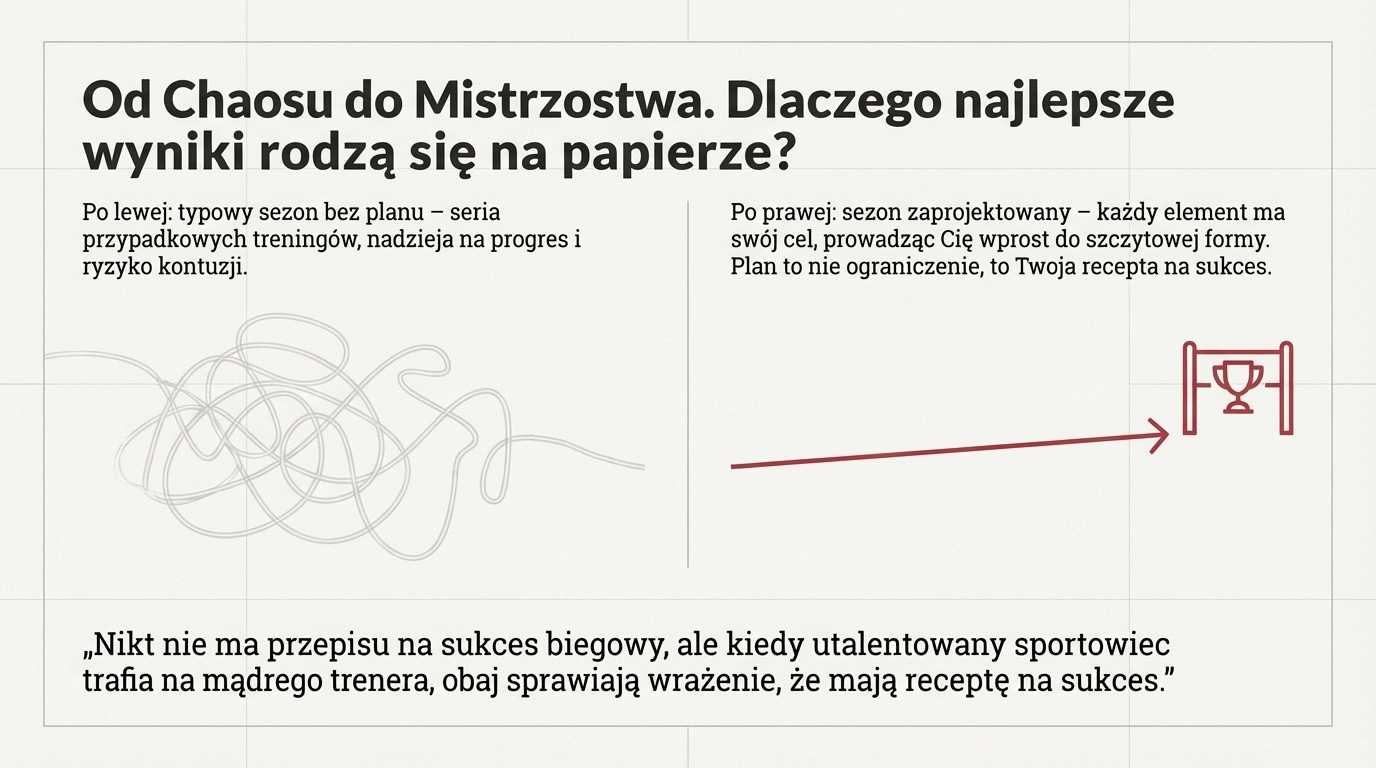 Czy zdarzyło Ci się wyjść na trening i zastanawiać się: „Co ja właściwie dzisiaj robię?”. Wielu biegaczy trenuje przypadkowo – trochę szybkości, długie wybieganie, potem przerwa, a potem nagły zryw przed zawodami. Jack Daniels w swojej książce stawia sprawę jasno:„Nikt nie ma przepisu na sukces biegowy, ale kiedy utalentowany sportowiec trafia na mądrego trenera, obaj sprawiają wrażenie, że mają receptę na sukces”.