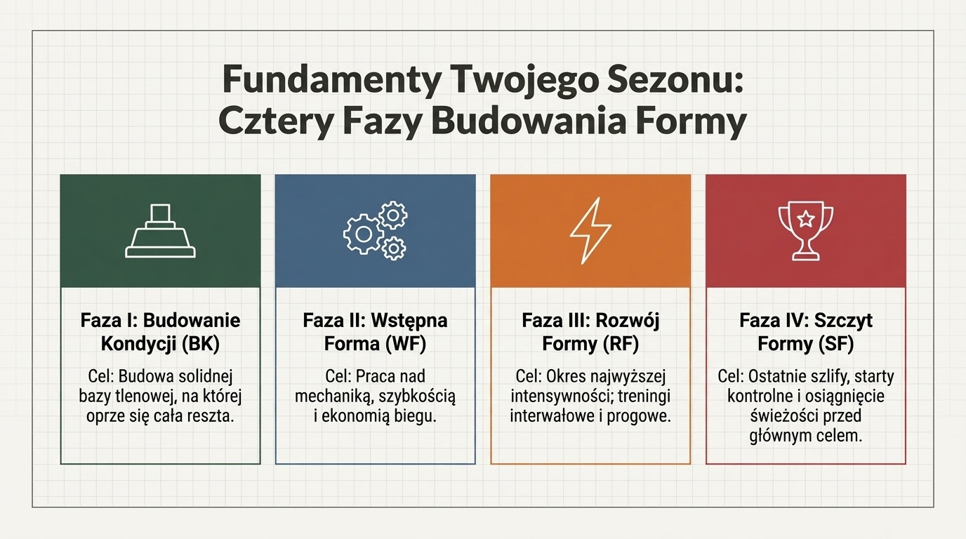 - Faza IV (SF - Szczyt Formy): Ostatnie szlify. Schodzimy z objętości (tapering), skupiamy się na Biegu Progowym (P) i specyfice startowej.