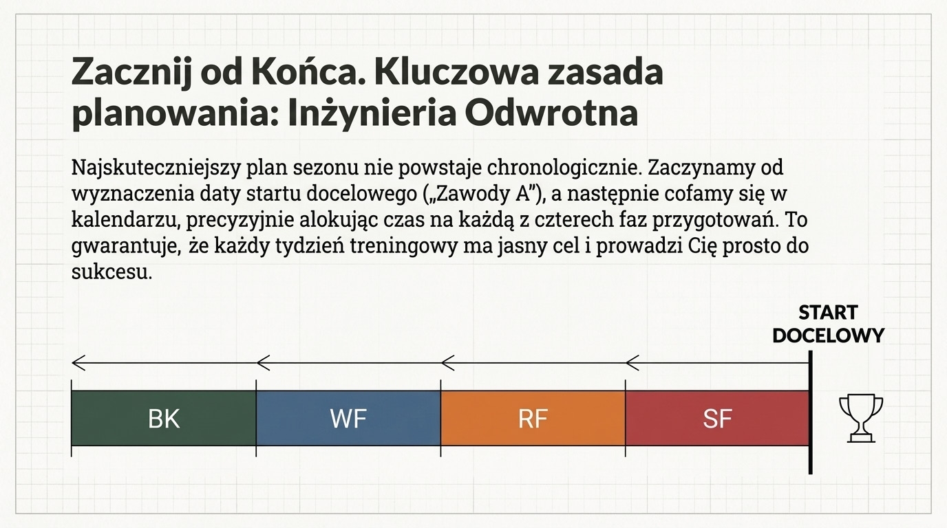 Zaznaczasz datę wyścigu po prawej stronie kartki. To koniec Fazy IV. Następnie cofasz się w czasie, alokując tygodnie na poszczególne etapy. To gwarantuje, że szczyt formy (Peak) przypadnie dokładnie wtedy, gdy go potrzebujesz, a nie miesiąc za wcześnie lub za późno.