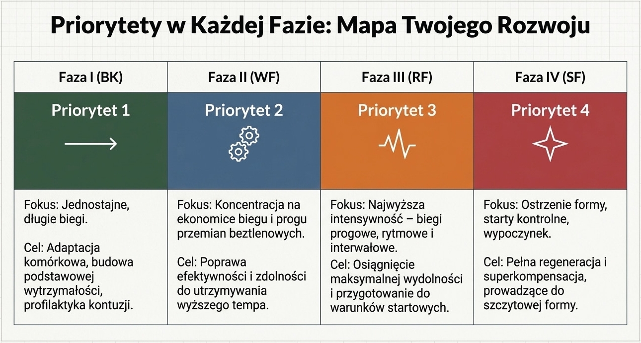 - Najważniejsza: Faza I (BK). Bez bazy tlenowej i adaptacji stawów ryzyko kontuzji jest zbyt duże.
