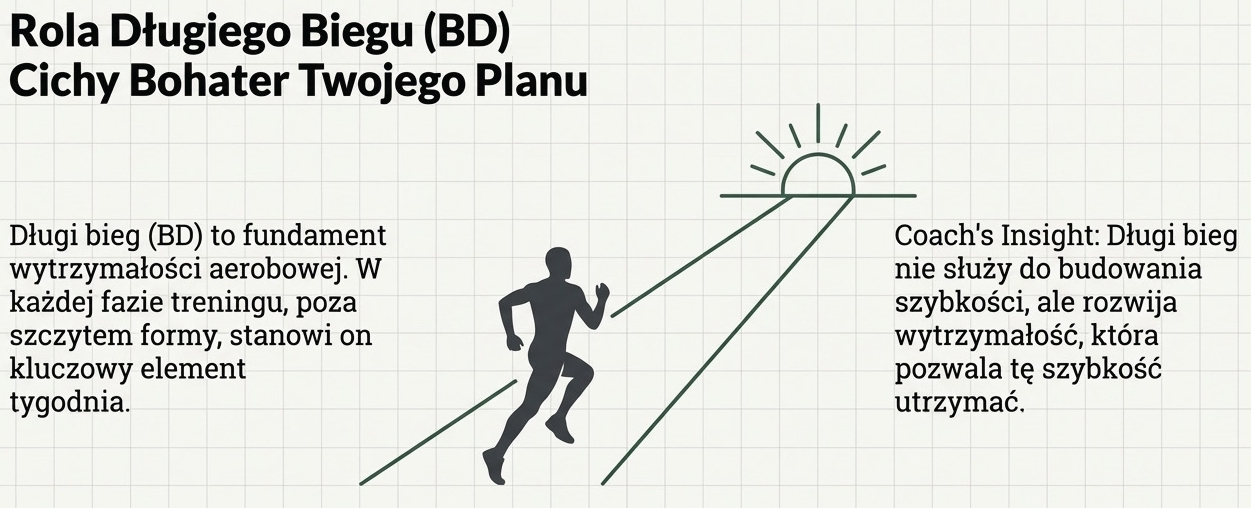Choć Daniels klasyfikuje go jako bieg spokojny (BS) ze względu na intensywność, dla maratończyków jest to kluczowa jednostka jakościowa. To on buduje wytrzymałość, która pozwala utrzymać prędkość wypracowaną na innych treningach aż do mety.