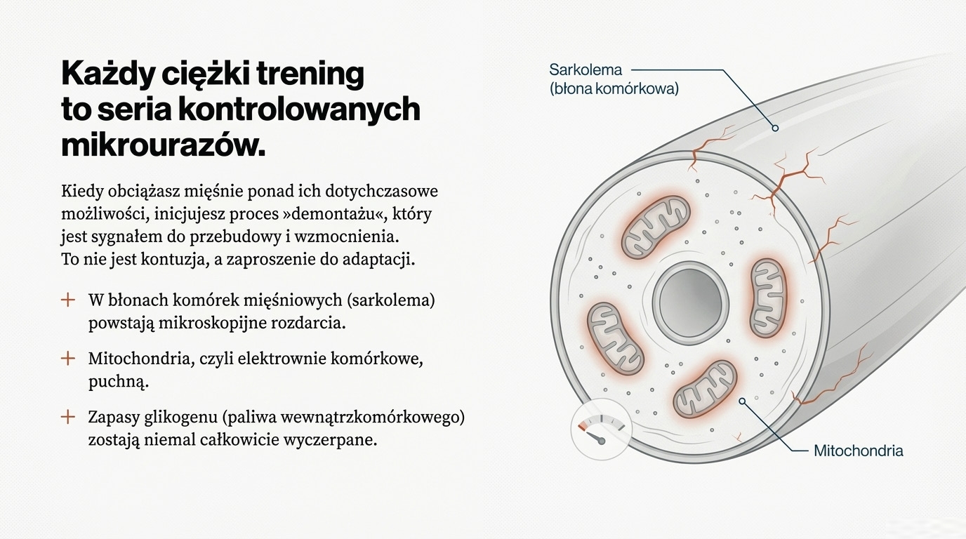 Błony komórkowe (sarkolemy) pękają, a mitochondria (elektrownie komórkowe) puchną. Brzmi groźnie? To wspaniała wiadomość! Te uszkodzenia są sygnałem dla organizmu: "Jesteśmy za słabi na to obciążenie, musimy się wzmocnić!". To właśnie ten impuls uruchamia proces budowania formy.