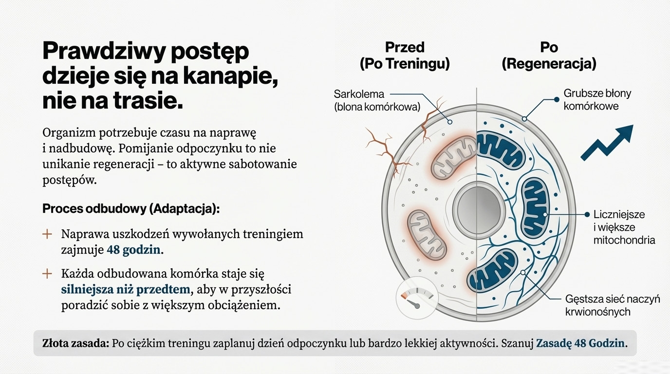 Proces naprawy uszkodzonych włókien zajmuje około 48 godzin. Organizm nie tylko łata dziury – on nadbudowuje tkankę "z zapasem" (to zjawisko superkompensacji). Mięśnie stają się silniejsze, a sieć naczyń krwionośnych gęstsza. Jeśli pominiesz odpoczynek, przerywasz ten proces w połowie, co prowadzi do chronicznego zmęczenia i kontuzji.