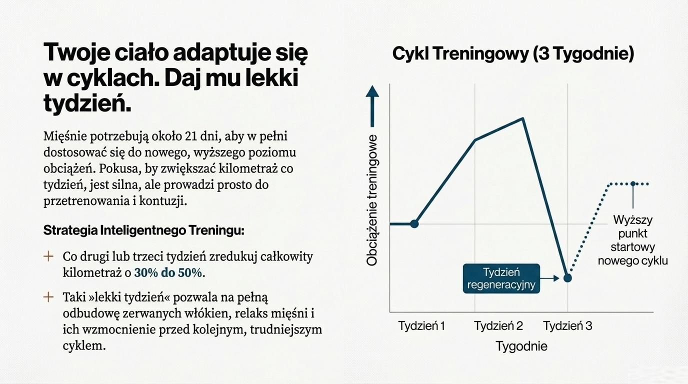 Dlatego liniowe zwiększanie kilometrażu co tydzień to pułapka. Inteligentny plan zakłada "schody": 2-3 tygodnie pracy, a następnie tydzień regeneracyjny (zmniejszenie objętości o 30-50%). To właśnie w tym lekkim tygodniu Twoje ciało "trawi" wykonaną pracę i wchodzi na wyższy poziom.