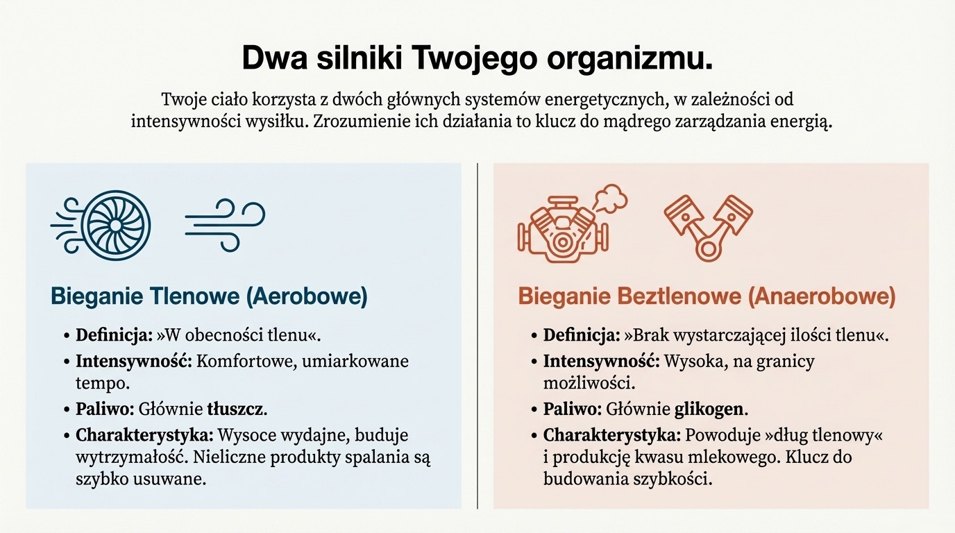 - Silnik Tlenowy (Aerobowy): Działa powoli, ale jest niezwykle wydajny. Spala głównie tłuszcz (którego mamy zapas na setki kilometrów). To Twój "diesel" na długie trasy.