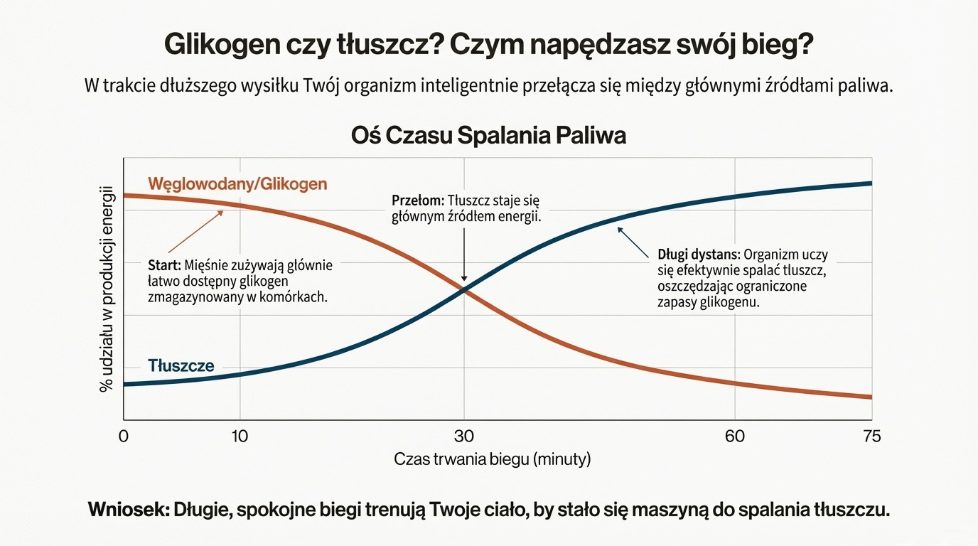 Na początku biegu spalasz głównie łatwo dostępny glikogen. Dopiero po około 30 minutach spokojnego biegu proporcje się odwracają i tłuszcz staje się głównym źródłem energii. Dlatego długie, wolne wybiegania są tak ważne – uczą one Twój metabolizm sięgać do głębokich rezerw tłuszczowych, oszczędzając glikogen na finisz.
