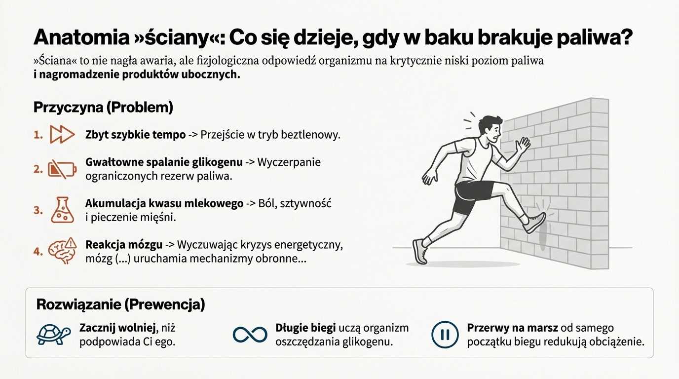 Czym jest mityczna "ściana" maratońska? To nie jest blokada psychiczna. To brutalna fizjologia. Występuje, gdy wyczerpiesz zapasy glikogenu w mięśniach i wątrobie.