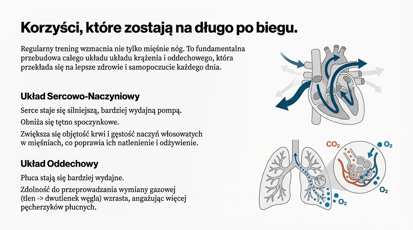 Twoje serce powiększa się i wzmacnia (pompuje więcej krwi przy jednym uderzeniu), dzięki czemu tętno spoczynkowe spada. W mięśniach powstają nowe naczynia włosowate (kapilaryzacja), które działają jak autostrady dostarczające tlen. To inwestycja w zdrowie, która procentuje 24 godziny na dobę.