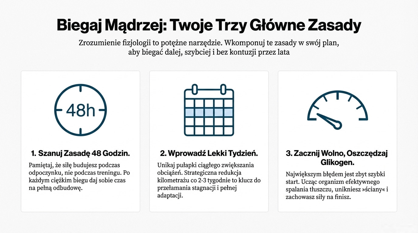 Szanuj zasadę 48 godzin regeneracji. Wprowadzaj lekkie tygodnie, by dać czas na adaptację. I pamiętaj – wolny początek to nie oznaka słabości, ale dowód fizjologicznej inteligencji.