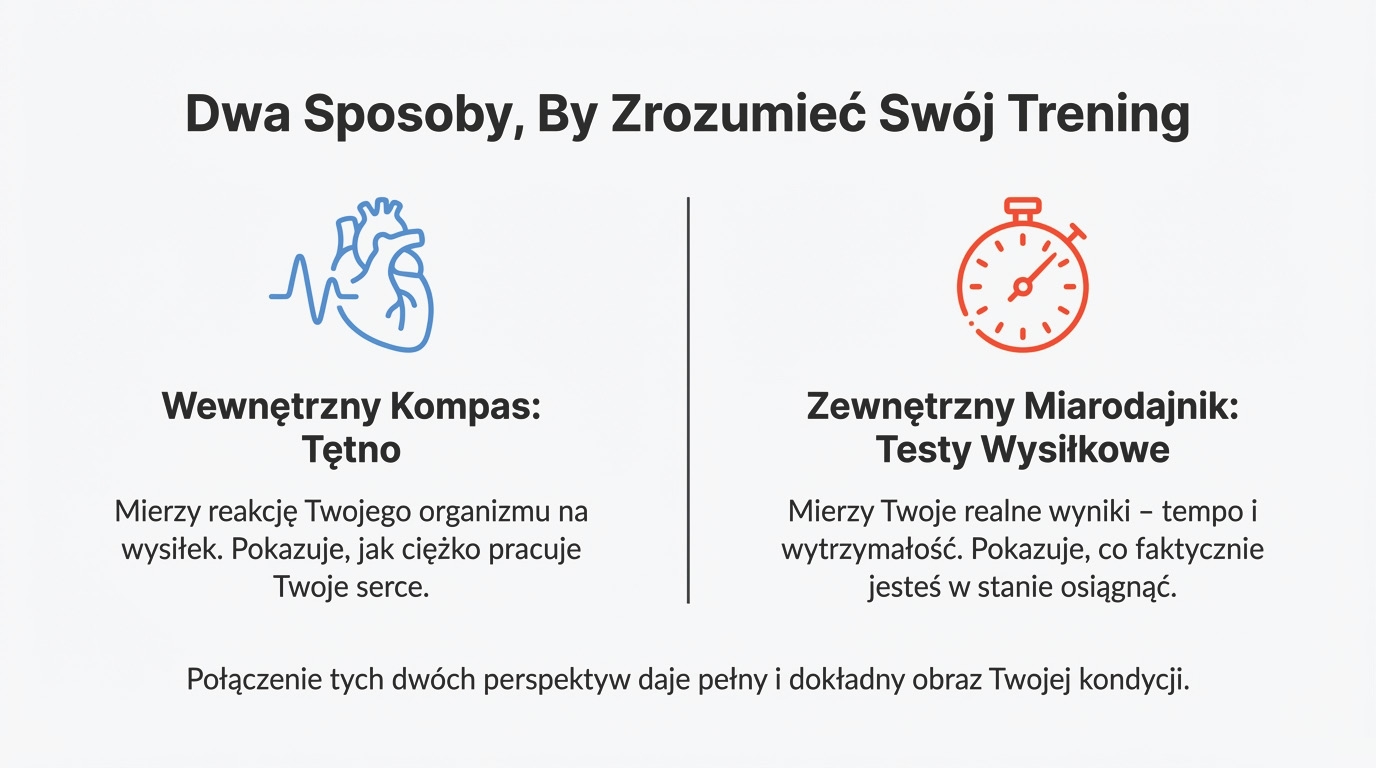 Aby biegać mądrze, musimy mierzyć to, co robimy. Mamy do tego dwa główne narzędzia: wewnętrzny kompas (tętno) oraz zewnętrzny sprawdzian (testy wydolnościowe). Dziś nauczymy się, jak ich używać, by nie błądzić we mgle.