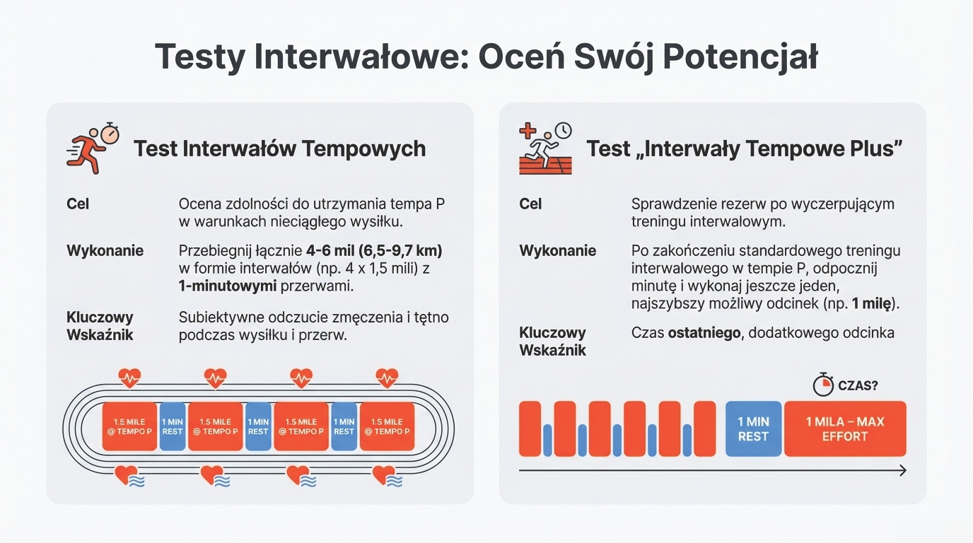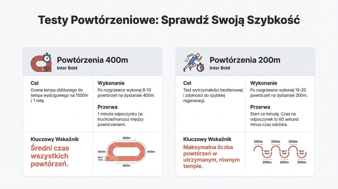 Cel: Utrzymać jak najrówniejsze, mocne tempo (zazwyczaj okolice tempa wyścigu na 1 milę). Jeśli Twoja średnia z 10 powtórzeń wynosi 90 sekund, a po miesiącu 88 sekund przy tym samym odczuciu zmęczenia – Twoja ekonomia i moc wzrosły.