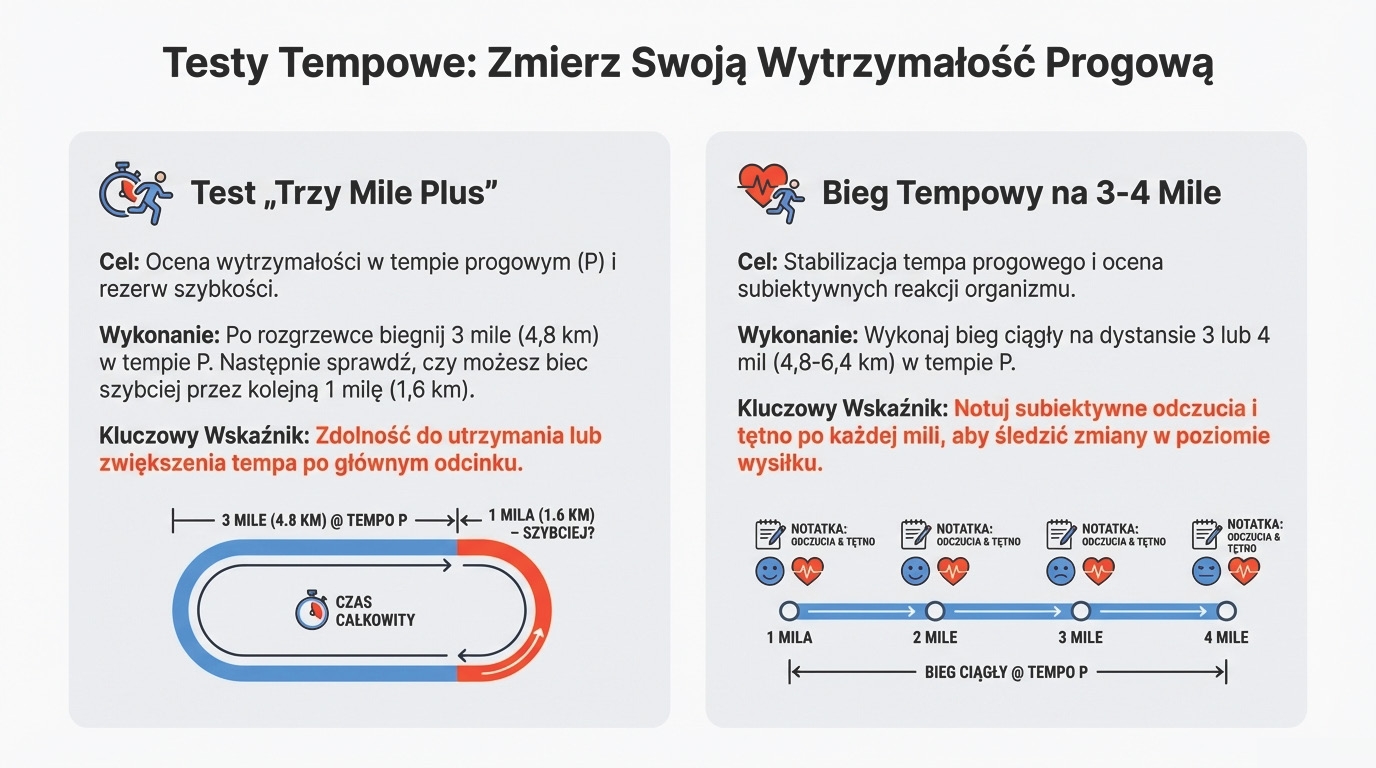 Kluczowy wskaźnik: Jeśli po 3 milach w progu jesteś w stanie mocno przyspieszyć, Twoja wytrzymałość progowa jest znakomita. Jeśli "umierasz" na ostatniej mili, znaczy to, że Twoje tempo progowe może być przeszacowane.