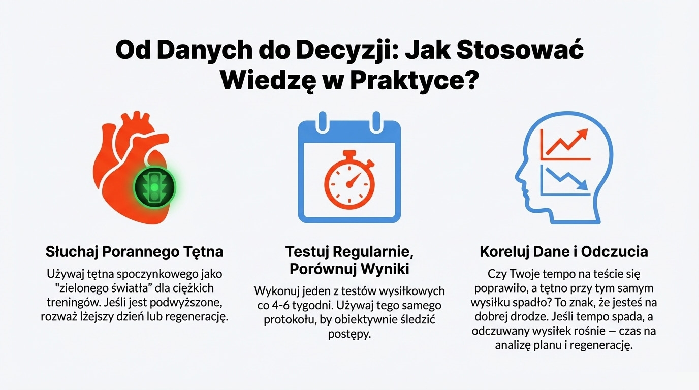 - Koreluj dane: Czy Twoje tempo na teście wzrosło, a tętno spadło? Świetnie. Jeśli tempo spada, a tętno rośnie – czas na odpoczynek.