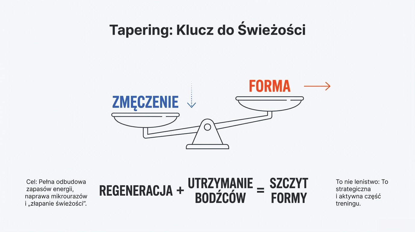 Pod koniec cyklu treningowego Twoja kondycja jest wysoka, ale zmęczenie skumulowane również. Celem taperingu jest drastyczne zredukowanie zmęczenia przy jednoczesnym utrzymaniu kondycji. Gdy zmęczenie spada szybciej niż wydolność, Twoja forma "wystrzeliwuje" w górę (superkompensacja).
