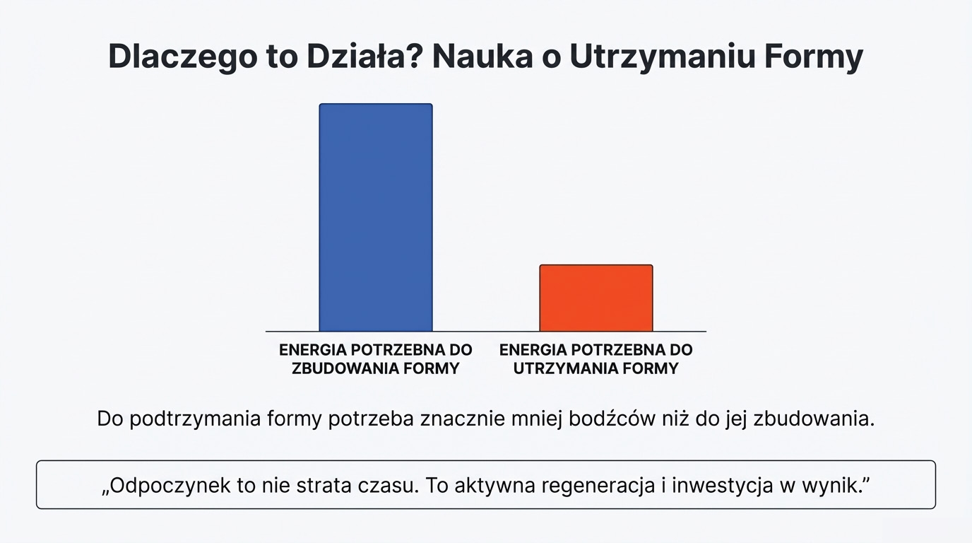 Dobra wiadomość jest taka, że utrzymanie formy kosztuje znacznie mniej energii niż jej budowanie. Badania cytowane przez Danielsa pokazują, że możesz zredukować trening nawet o kilkadziesiąt procent, a Twoje VO2max i próg mleczanowy pozostaną na wysokim poziomie przez wiele tygodni.
