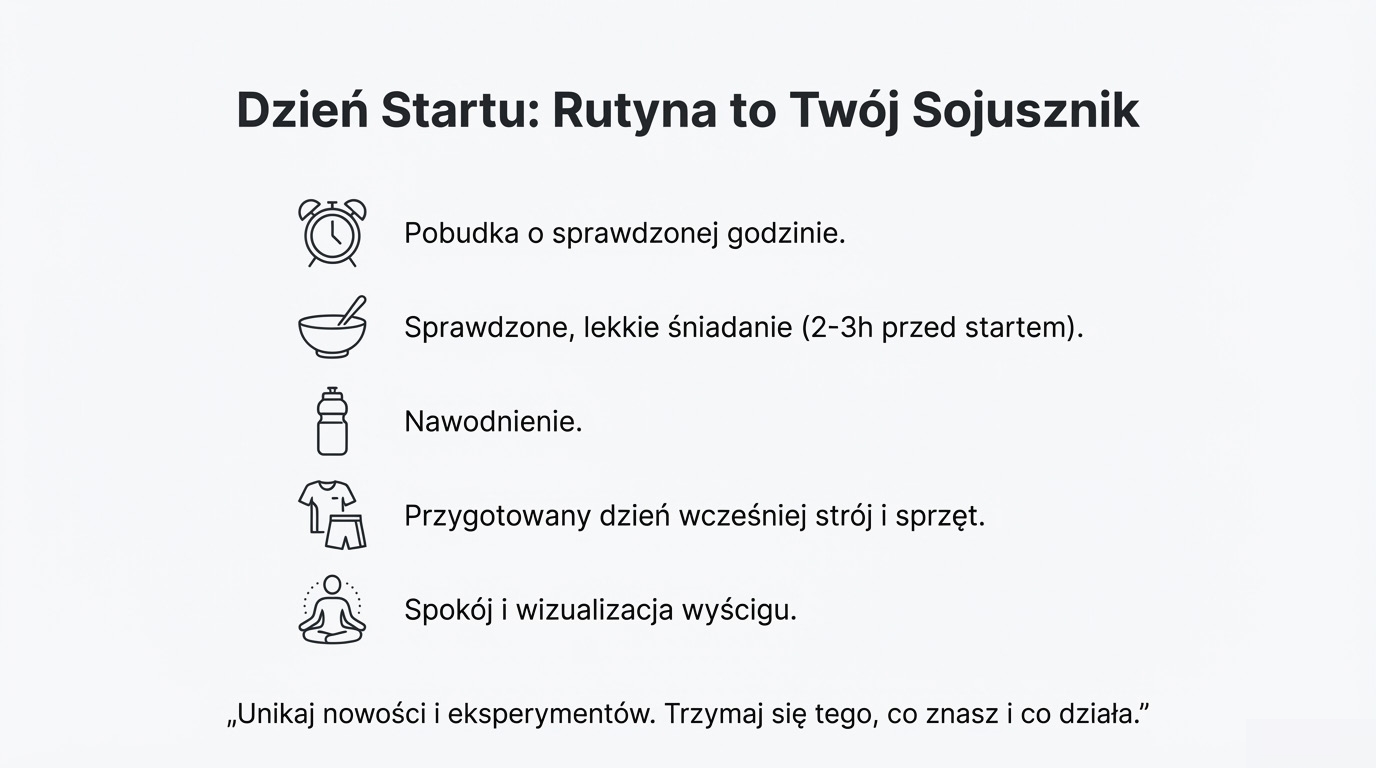 W dniu wyścigu nie ma miejsca na eksperymenty. Wszystko – od śniadania, przez skarpetki, aż po żele energetyczne – musi być przetestowane wcześniej. Stres startowy jest wystarczającym obciążeniem, nie dokładaj sobie problemów żołądkowych czy obtarć.