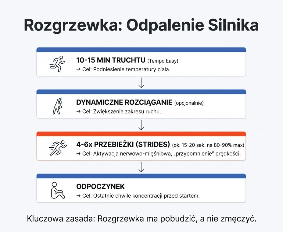 Im krótszy dystans (np. 5 km), tym intensywniejsza powinna być rozgrzewka. Przed maratonem wystarczy krótki trucht i mobilizacja, by oszczędzać glikogen. Kluczowe są "przebieżki" (strides) tuż przed startem – przypominają nogom, że zaraz będą musiały się kręcić szybko.