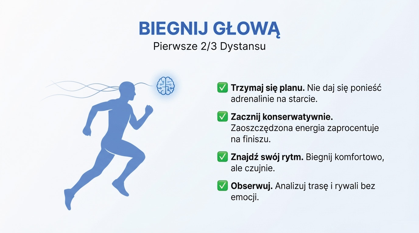 To czas chłodnej kalkulacji. Nie daj się ponieść adrenalinie i tłumowi na starcie. Zacznij konserwatywnie. Jeśli czujesz się świetnie na 5. kilometrze maratonu – zwolnij, to pułapka. Trzymaj się planu, pij, jedz i oszczędzaj energię. Bądź jak księgowy, który liczy każdy wydatek energetyczny.