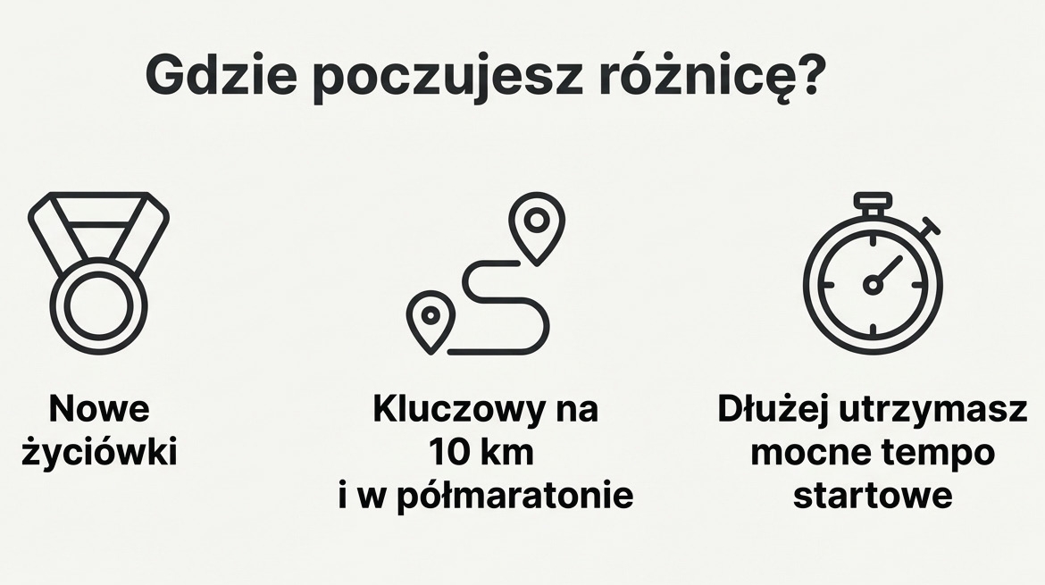 Efekt? Krzywa przesuwa się w prawo. Tempo 4:30 min/km, które kiedyś Cię "zakwaszało", teraz staje się tempem w pełni tlenowym. Możesz biec szybciej przy tym samym zmęczeniu.