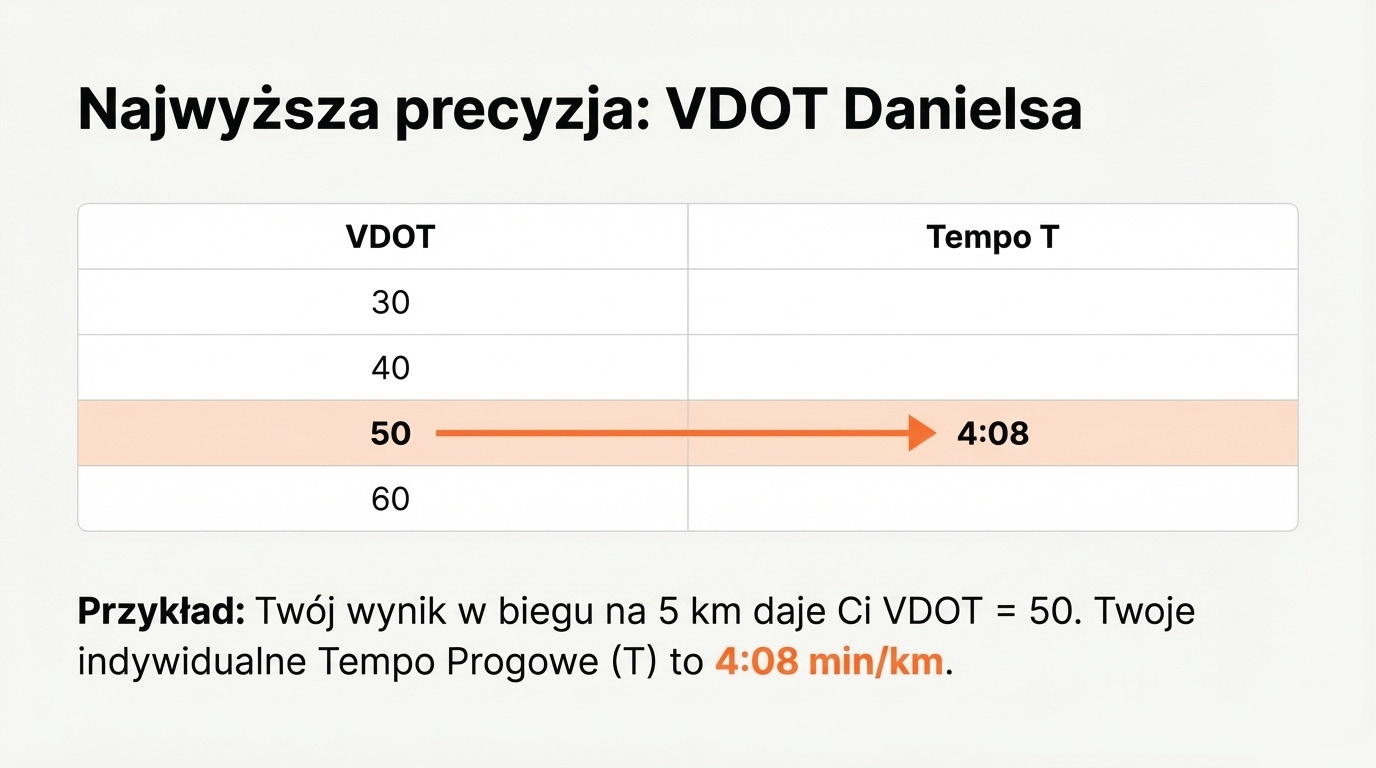 Przykładowo: Jeśli Twój VDOT to 50 (5 km w 19:57), Twoje tempo progowe to 4:08 min/km.