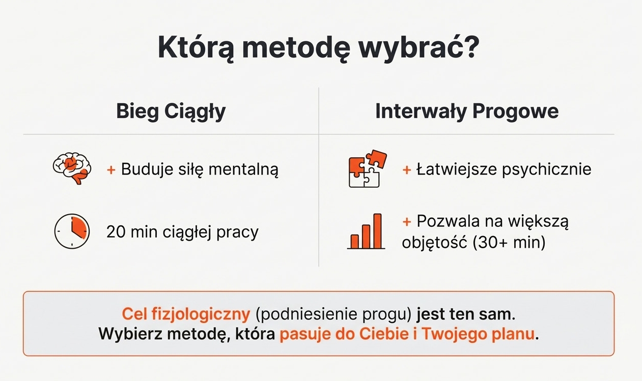 Daniels wyróżnia dwa główne sposoby realizacji treningu progowego. Oba są skuteczne, ale różnią się obciążeniem psychicznym i możliwą do wykonania objętością.