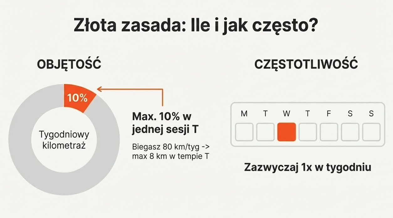 Ile tego biegać? Daniels zaleca, aby objętość treningu progowego nie przekraczała 10% tygodniowego kilometrażu. Zazwyczaj wykonuje się jedną taką sesję w tygodniu.