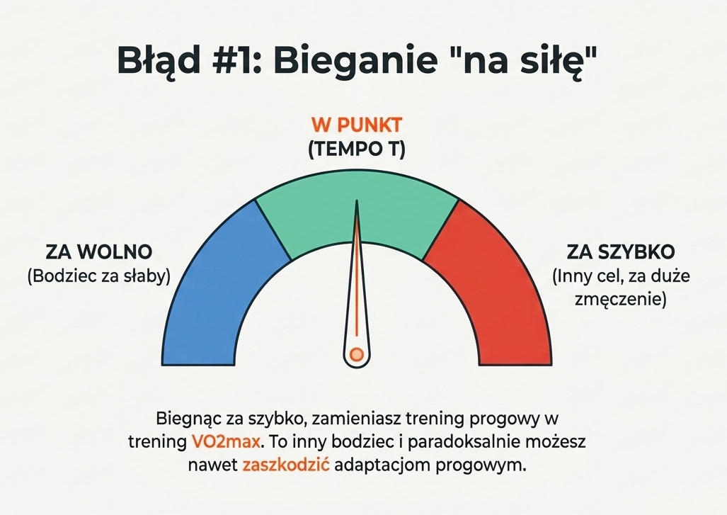 Jeśli Twoje tempo progowe to 4:15, a Ty biegniesz 4:05, bo "czujesz moc", paradoksalnie psujesz trening. Wchodzisz w strefę VO2max, zakwaszasz się i skracasz czas efektywnej pracy. W treningu progowym dyscyplina jest ważniejsza niż ambicja.